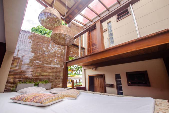 São dois ambientes: o primeiro é uma sala que abriga duas camas de solteiro, uma rede e a varanda onde há futons de casal exclusivos dessa acomodação - ótimos para relaxar após o dia de praia e passeios. E no outro ambiente fica a cama de casal Queen Size e o banheiro privativo do quarto.