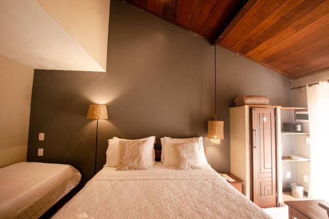 Possui varanda interna com rede e também cama casal Queen Size e uma cama de solteiro.